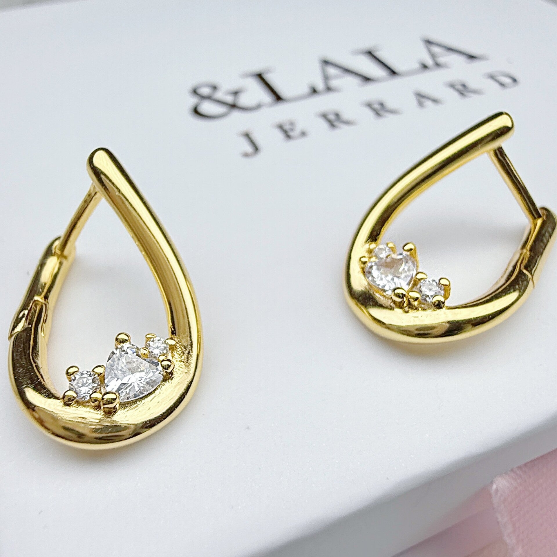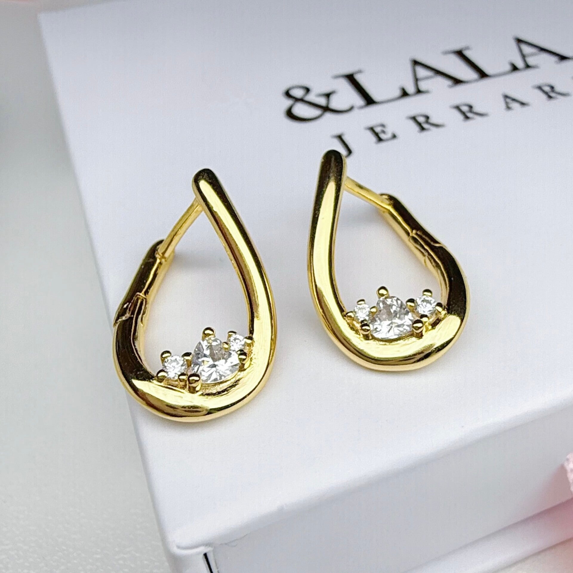 A modern twist on a classic hoop. These sleek teardrop-shaped earrings are crafted in polished gold and set with a trio of sparkling cubic zirconia stones.
